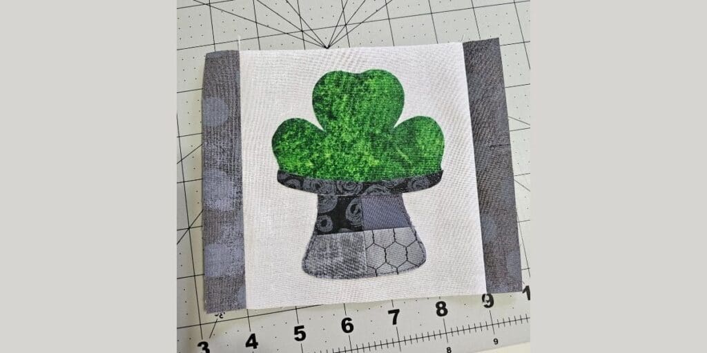 Repeat these steps with both 1 x 6 1/2 inch strips stitched to the top and bottom of your Shamrock quilt block. Press both seams open.