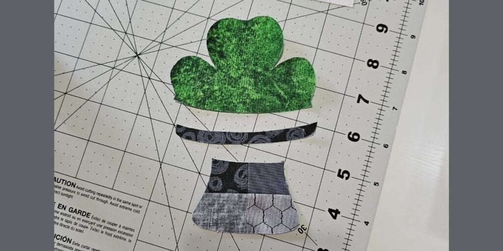 Lay out your 6 x 6 inch background fabric square and center your pieces. Shamrock on top of the Hat Body. Then lay the Hat Brim across the middle. When you have the pieces centered as you like them. Press them with an iron to fuse it all in place.