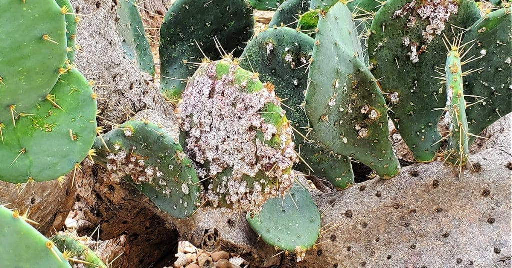 It’s called the Cochineal bug and they live in the small barnacle looking things on the paddles of the Prickly Pear Cactus. Going back even before the ‘old west’ days, these bugs were harvested and crushed into a paste to make red dyes for everything from food to clothing. We still use them today! Maybe that’s why red food coloring has such a distinct taste?